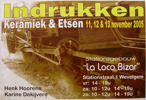 In 2002 hadden wij, Karine Dekijvere met etsen en ik met keramiek, onze eerste tentoonstelling 'Twee Gezichten'. Deze maal noemde we onze expositie 'Indrukken'. We hadden gelukkig opnieuw een toffe locatie gevonden, het oud stationsgebouw van Wevelgem. Het werd tevens de eerste en laatste tentoonstelling in deze locatie.