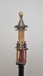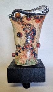 2026Een fijn en kleurrijk keramiekwerk op een zwarte houten standaard. Met een subtiel Red Light !